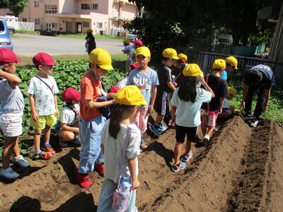 保育園側にある学校農園に、全学年の児童が大根の種を植えました。