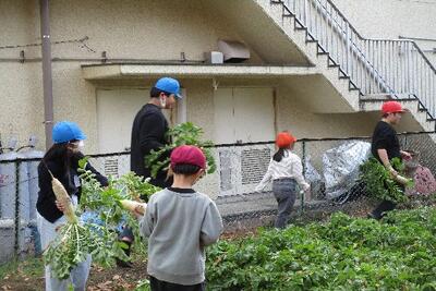 だいこん育成 収穫「だいこんとったぞ!」 投稿: 校長 (12/09) カテゴリー: 今日の出来事 だいこんを育て、今日ようやく収穫です。並木の畑ですくすくと育っただいこんを児童は楽しそう抜いていました。昇降口で新聞紙に巻き、収穫したものを持って帰ります。種を植えて、収穫します。命を育み、いただく学習をしっかりと学びました。おいしく食べてね! Tweet -