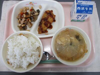 ごはん ぎゅうにゅう サワラのさいきょうやき こまつなのごまあえ 肉じゃが