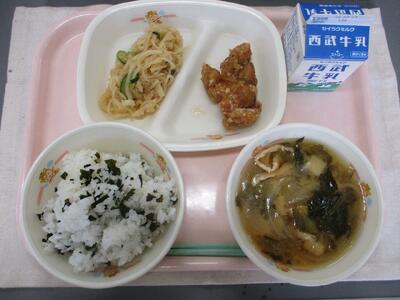 わかめごはん ぎゅうにゅう とり肉のやくみソース きりぼしだいこんのはりはりづけ こまつなとじゃがいものみそしる