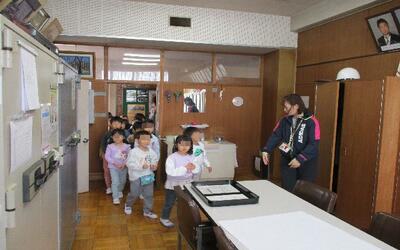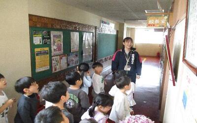 お隣、並木保育園の子供たちを1年生が案内役となって校舎探検を